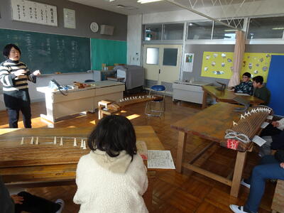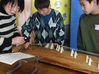 5年生が、講師の待井先生をお招きして琴教室を行いました。琴は、5年生の音楽の教科書にも載っています。