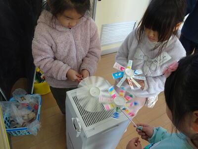 1年生が前回同様、かざぐるまを作りました。今回は思い思いに色を塗りました。