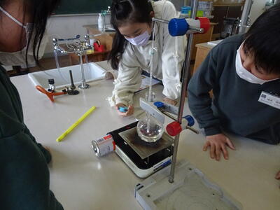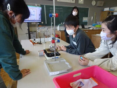4年生が理科の時間に「水をあたためるとどうなるか」実験しました。1分ごとに温度を測ったり、様子を観察したりしました。