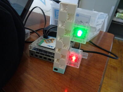 6年生のプログラミング学習の様子です。今日の課題は「押しボタン式信号機をつくろう」です。おなじみ「スクラッチ」を使って、プログラムを作っていきます。ボタンを押すと「赤から青に変わる」「音が出る」とか、「〇秒間続く」などの命令を組み合わせていきます。