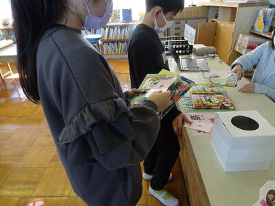 4年生が図書室で本を借りていました。新しい本が人気でした。