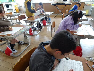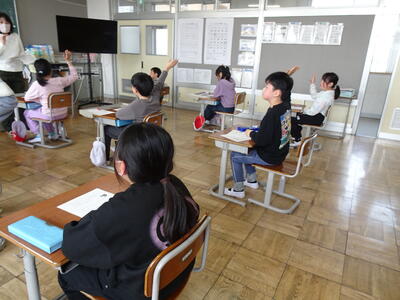 5年生は、「in」「on」「under」など位置や場所を英語で表す学習(外国語)でした。ジャスチャーゲームなどで楽しみながら使い方を学びました。