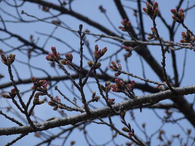 桜のつぼみが色づき始めました。もう少しで開花しそうです。
