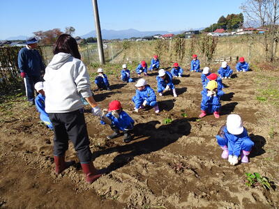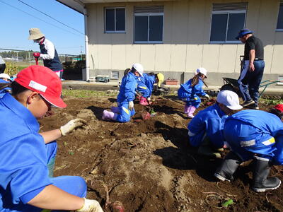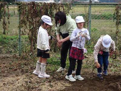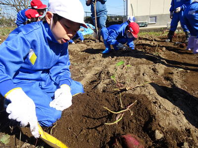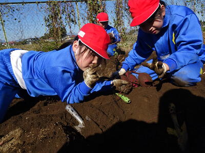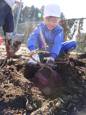 1、2、3年生が春に植えたサツマイモを収穫しました。説明を聞いて一斉に掘り始めると・・・