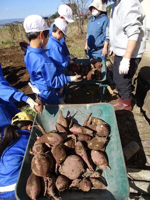一輪車2台分のサツマイモが収穫できました。家にも持ち帰りますが、後日、学校でも試食する予定です。