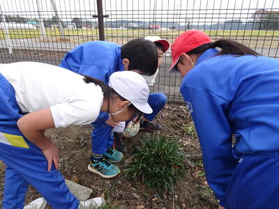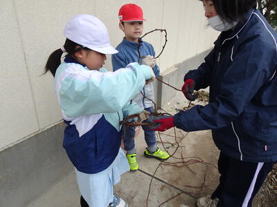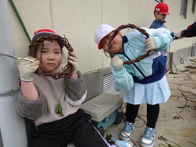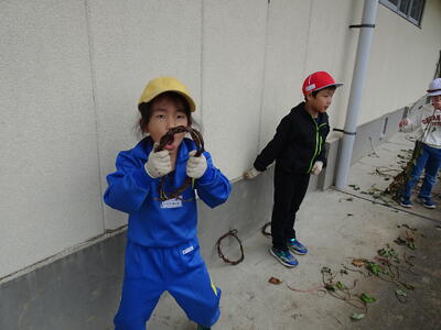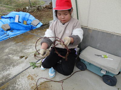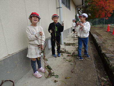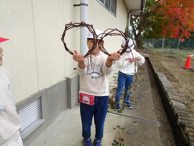 1、2年生が、昨日収穫したサツマイモのつるを使ってリース作りを始めました。