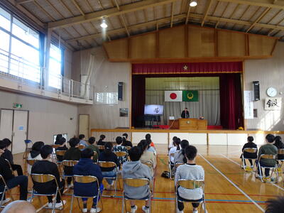 校長の話の後、学習、生活、保健安全のそれぞれの担当者が、冬休みの過ごし方について話をしました。年末年始は、日本の伝統行事や風習を楽しみながら、家族との団らんを大切にして欲しいと思います。