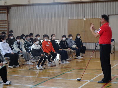義手でありながらも、学生時代は野球に打ち込み、活躍した話を聴いて、子供たちは真剣な表情で聴いていました。子供たちとキャッチボールもしていただいたり、ゴルフのスイングを見せていただいたりしました。子供たちは、その様子にとても驚いていました。