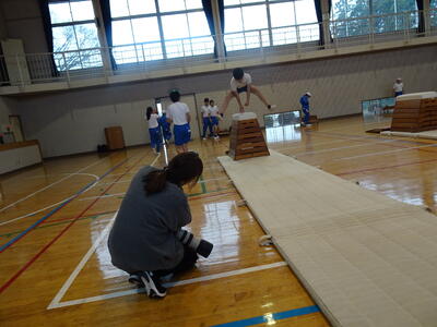 3、4年生が跳び箱運動で、「台上前転」に挑戦していました。段階的に少しずつ練習に取り組んできました。