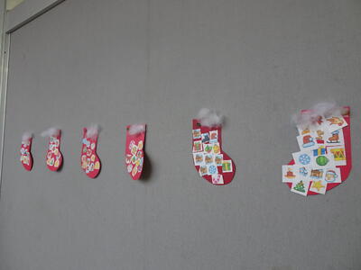 外国語(英語)学習に、サンタがやってきました。1年生は、サンタさんに英語で欲しいシールを伝え、それを使って飾りを作りました。