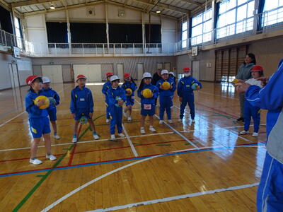 1、2年生も、同様にボールに慣れることから始まりました。1年生は初めての体験でしたが、みんな元気いっぱいに動いていました。