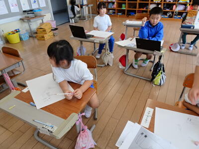 1年生は、昨日の遠足の思い出を絵に表しました。餌やり体験を思い出して、牛や山羊の絵を描く子が多かったです。
