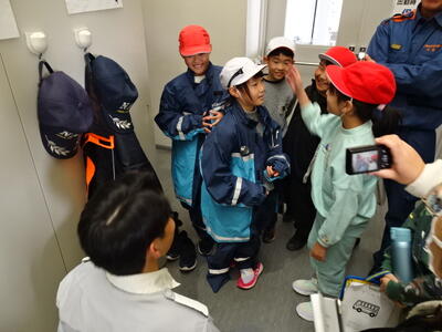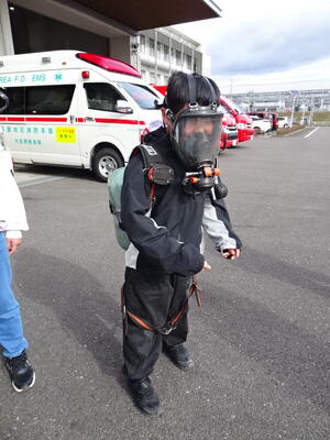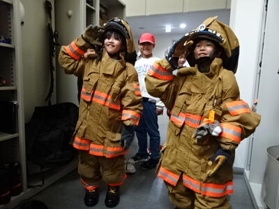 消防士さんの服や装備も体験させていただきました。子どもたちにとって貴重な体験となりました。