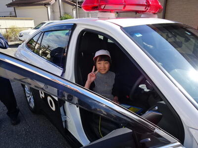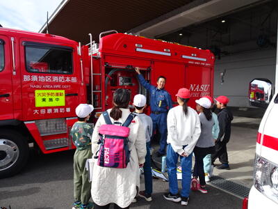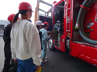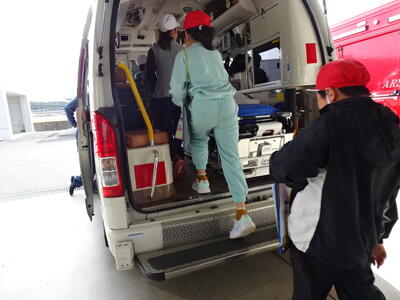 救急車や消防車も見るだけでなく、中にも入らせていただきました。初めて見る色々な装備に驚いていました。