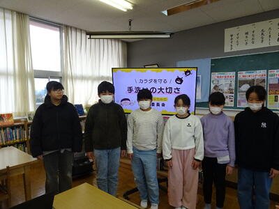 今回のテーマは「手洗いの大切さ」です。全校生にとったアンケートをもとに、全校生に呼びかけました。