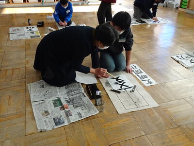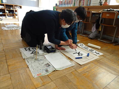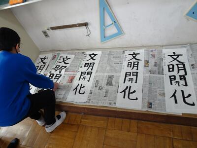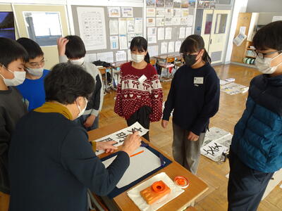 6年生は、書写指導を行いました。石曽根先生から、今年の書き初め課題「文明開化」を教えていただきました。一画一画丁寧に、書き方のポイントを教えていただきました。