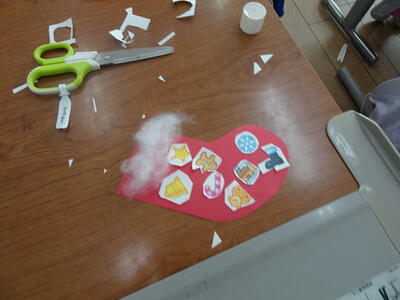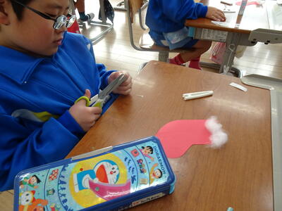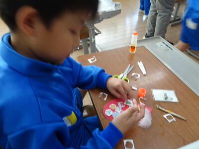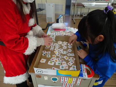 外国語(英語)学習に、サンタがやってきました。1年生は、サンタさんに英語で欲しいシールを伝え、それを使って飾りを作りました。