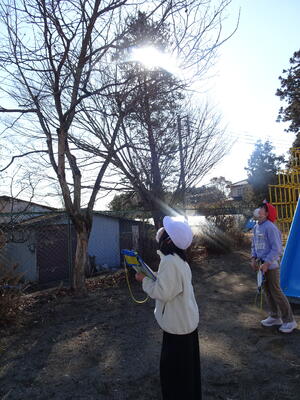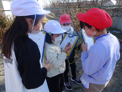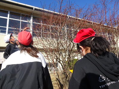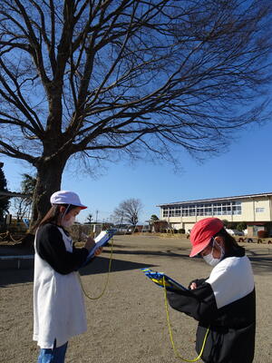 校庭を見ると、理科の学習で「冬の樹木の様子」を観察している学年が。特に、枝の先端がどうなっているか観察していました。けやきもすっかり葉を落としています。残念ながら枝の先端は観察できませんでした。
