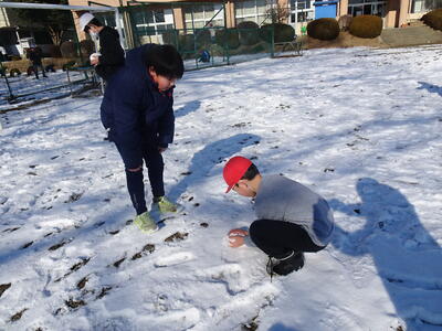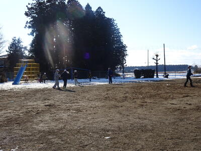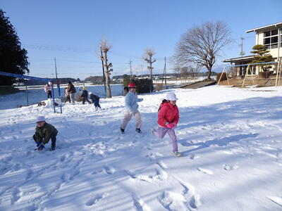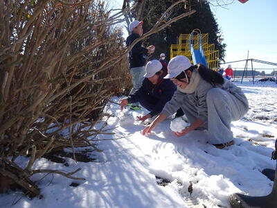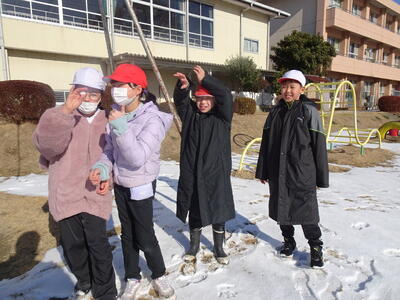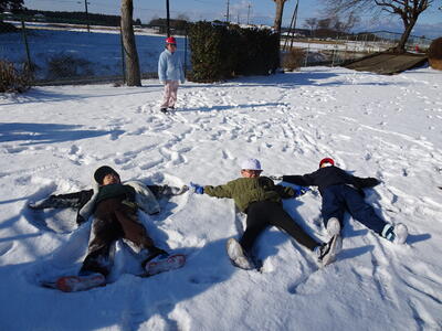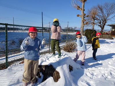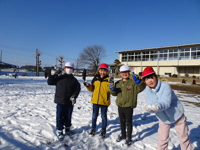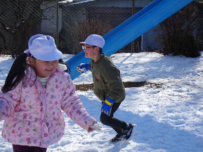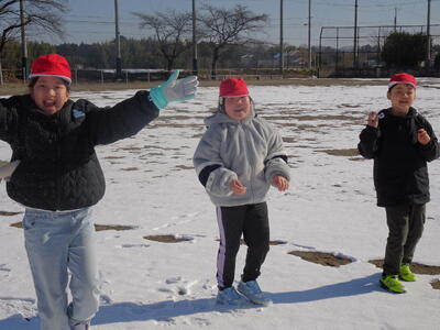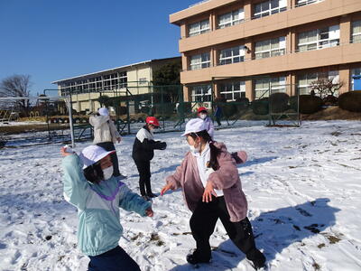 今日になっても校庭には雪が残り、子供たちは元気に雪遊びを楽しみました。1年生は、生活科の学習でも雪遊びをしました。