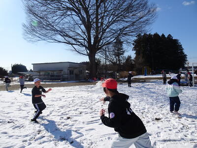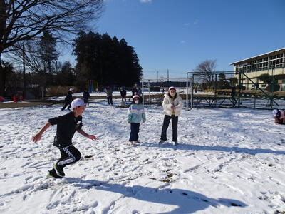 業間の休み時間には、全校生が出てきて遊んでいました。あちこちで雪玉が飛び交っていました。