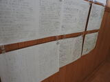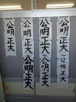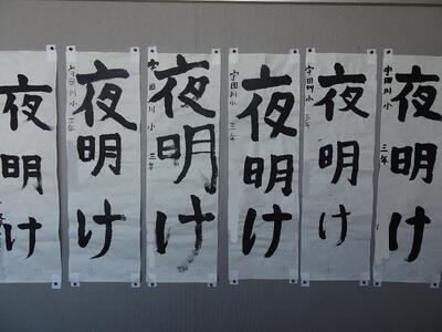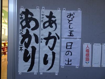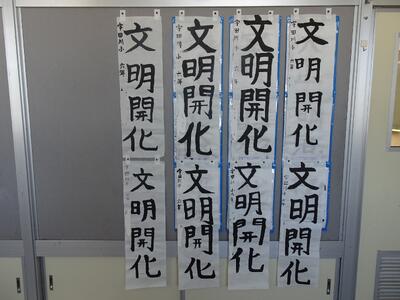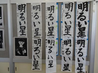 冬休みに書いてきた書き初めを掲示しています。下野教育書き初め展に出品する作品は、「明」が共通のテーマです。書き初めは「字が上手くなる」ことを願う伝統行事でもあります。