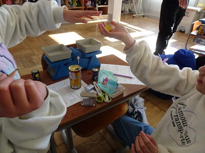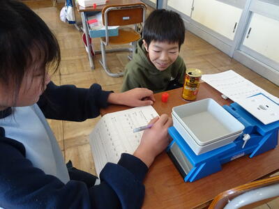 最後は上皿てんびんで比べました。予想と違う意外な結果がでて驚いていました。