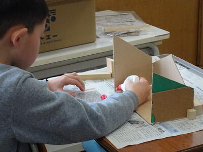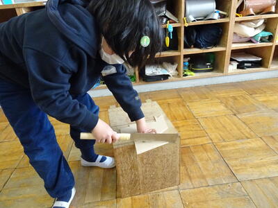 4年生の図工は、板を切って棚や入れ物を作る学習です。薄いベニヤ板をのこぎりで切るのは、なかなか難しいです。