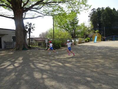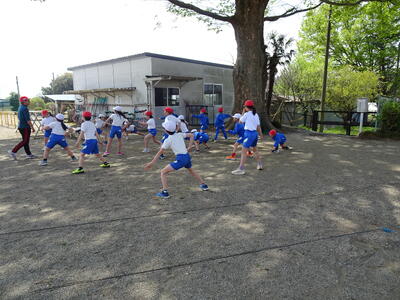 校庭で体育の授業をする学年。けやきの陰がありがたい陽気でした。運動会に向けて、50m走を計測していました。