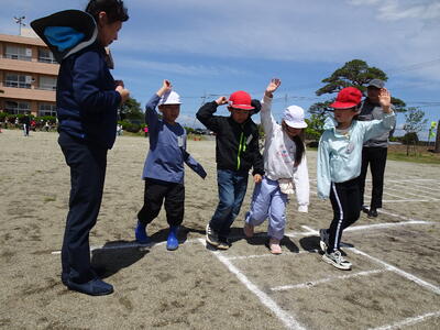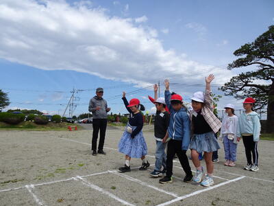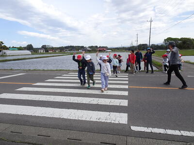 1、2年生は、校庭の模擬道路を使い、手をあげて左右確認してから横断することを学び、練習しました。