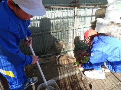 休み時間に、うさぎのララちゃんの世話をする子供たちです。水を換えたりトイレの掃除をしたり、大変な作業にも一生懸命に取り組んでいます。