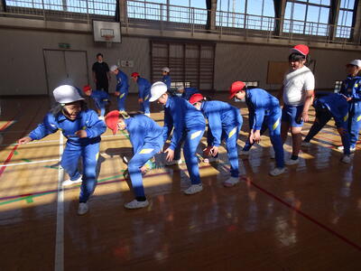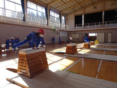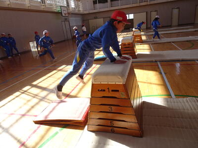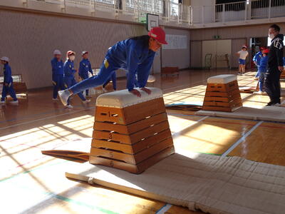 3、4年生が跳び箱運動で開脚跳びの練習をしていました。まずは跳び箱を横にして跳ぶ練習です。しっかり踏み切ること、手をしっかり着くことが大切です。