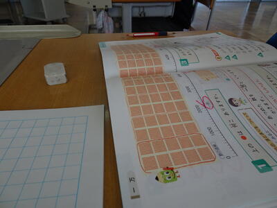 2年生は、算数で「一万」の大きさや数の仕組みについて調べました。教科書には、実際に一万の「・」が書いてあり、イメージがしやすいです。百や千のまとまりがどれくらいなのか、考えました。