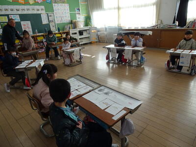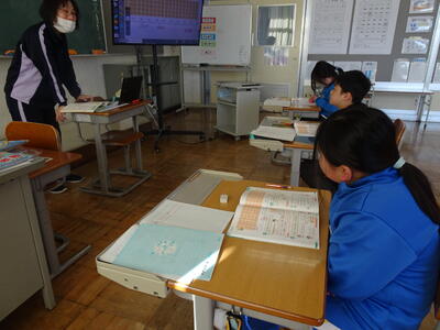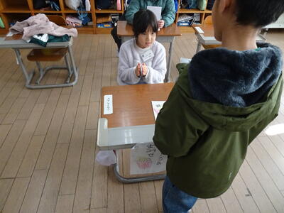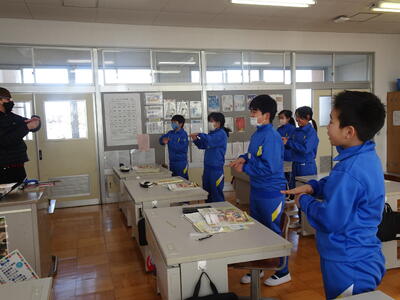 5年生は、「in」「on」「under」など位置や場所を英語で表す学習(外国語)でした。ジャスチャーゲームなどで楽しみながら使い方を学びました。
