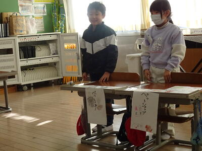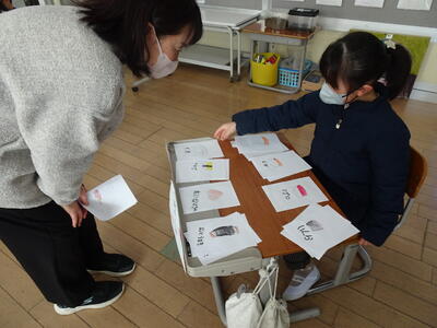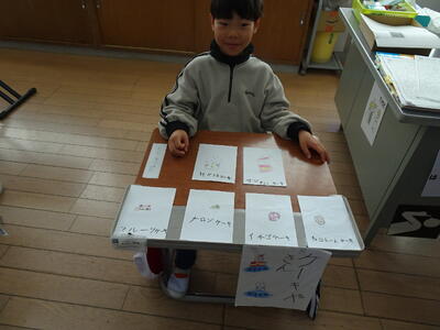 実は、1年生の国語「もののなまえ」という単元で、お店やさんになって「1つの名前」と「まとめて付けた名前」の違いを学ぶ学習でした。けやき学級のお友達もお客さんとして招待されました。この日のために、商品を作ったり店員さんとしての台詞を準備、練習したりしてきました。